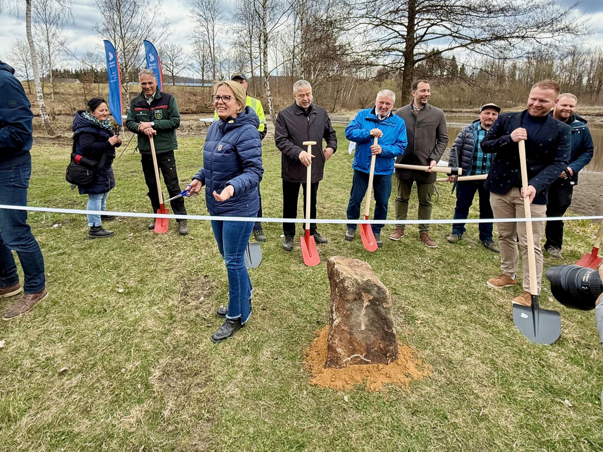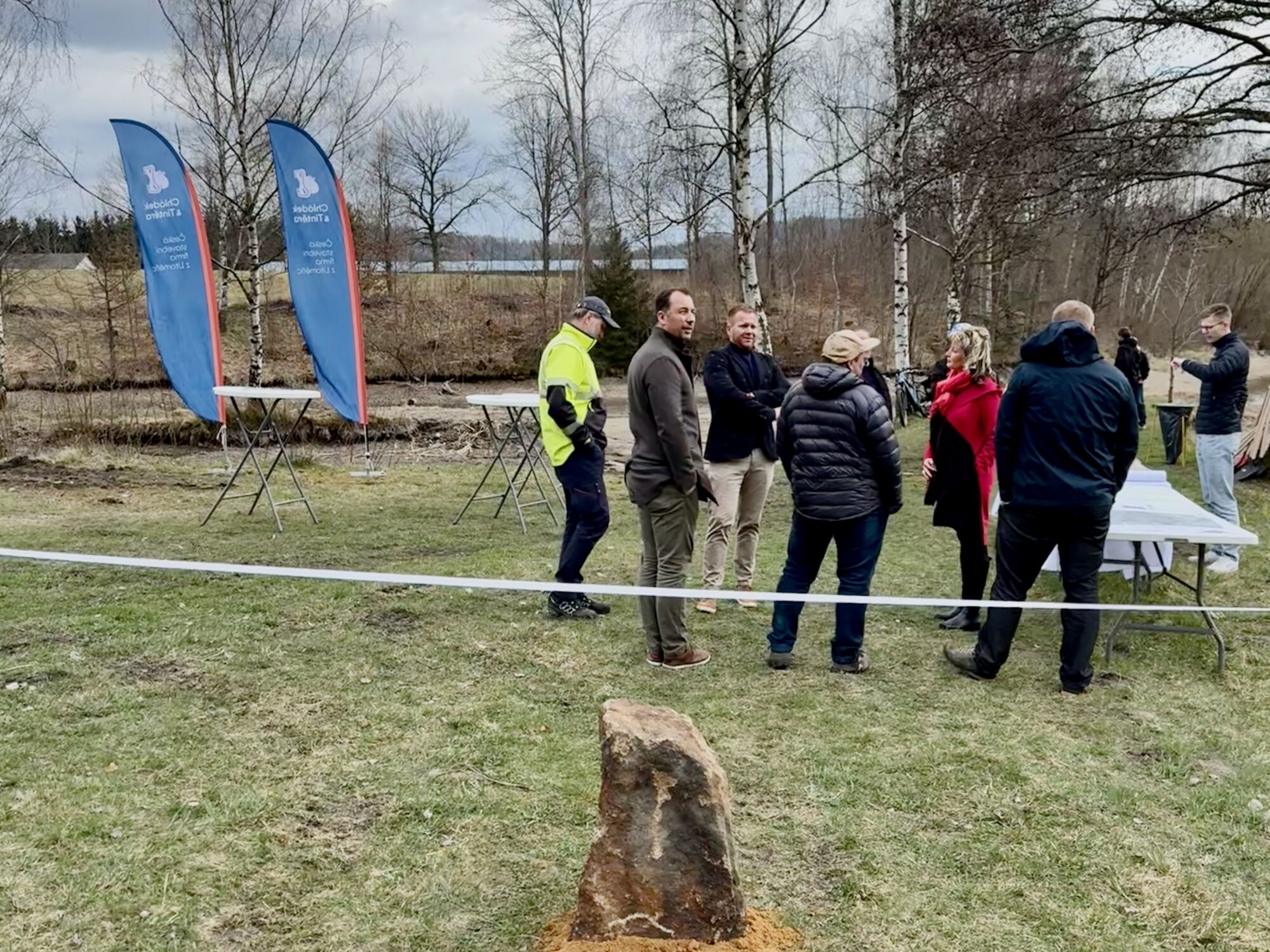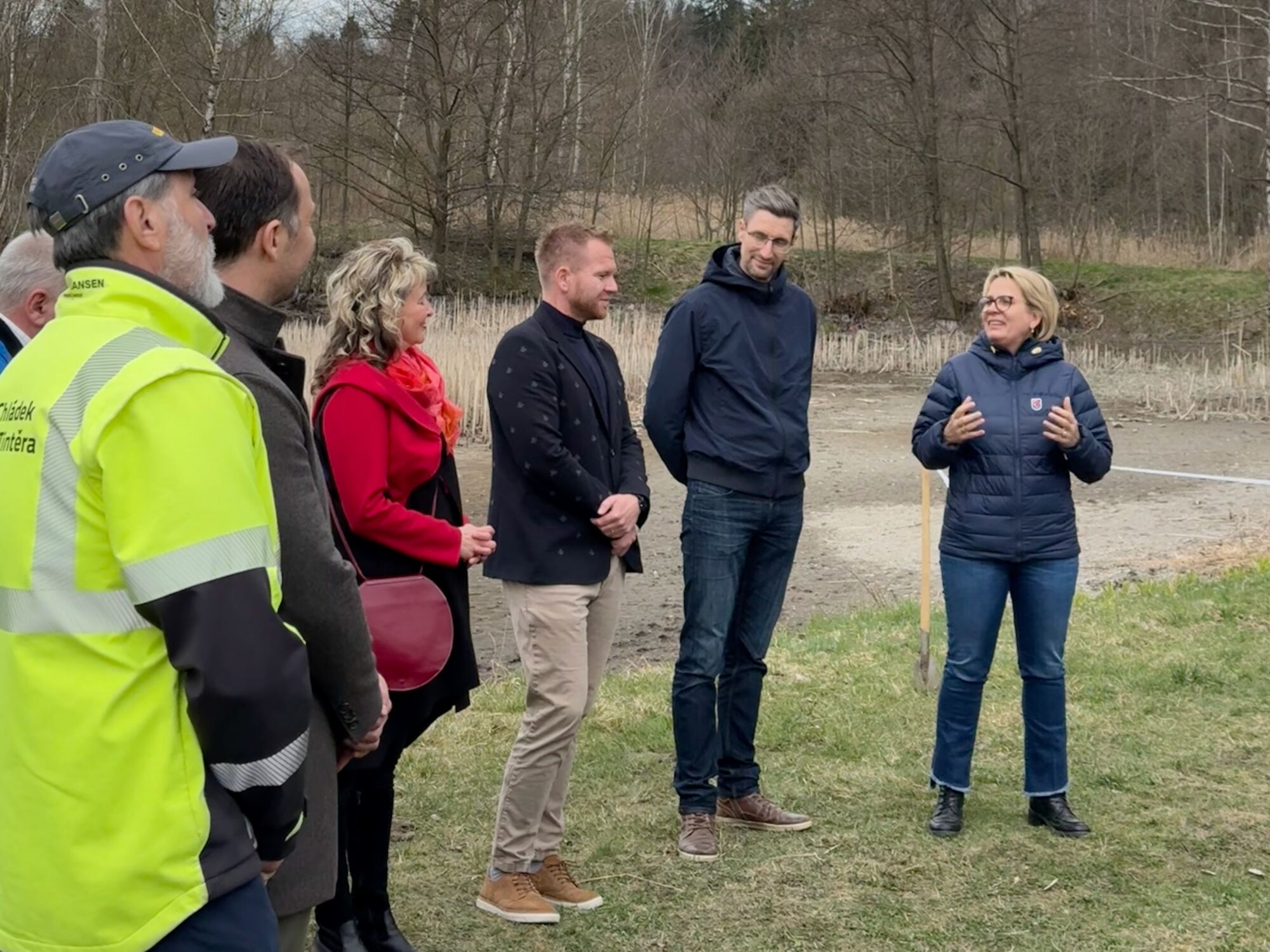 Na krásném místě mezi třemi rybníky se sešli zástupci veřejné správy i stavebních firem, za německou stranu to byla saská ministryně pro kulturu a turismus Barbara Klepscha zemský rada pro oblast Saské Švýcarsko / Východní Krušné Hory Michael Geisler, kteří přišli ze Sebnitz pěšky po trase budoucí cyklostezky společně se zástupci dalších institucí, novináři a veřejností. Za českou stranu se pak zúčastnil starosta Dolní Poustevny Robert Holec a další zástupci veřejného života v regionu. Za nás jako za realizátora stavby cyklostezky byl na místě generální ředitel naší společnosti Emil Filip a stavbyvedoucí Fridrich Herceg. V krátkých proslovech se mluvilo o přeshraniční spolupráci v tomto regionu, o důležitosti těchto projektů pro cestovní ruch i místní obyvatele.