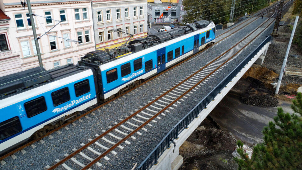 V pondělí 16. září byl podle harmonogramu obnoven dvoukolejný provoz na novém železničním mostě přes Spojeneckou ulici v Teplicích.