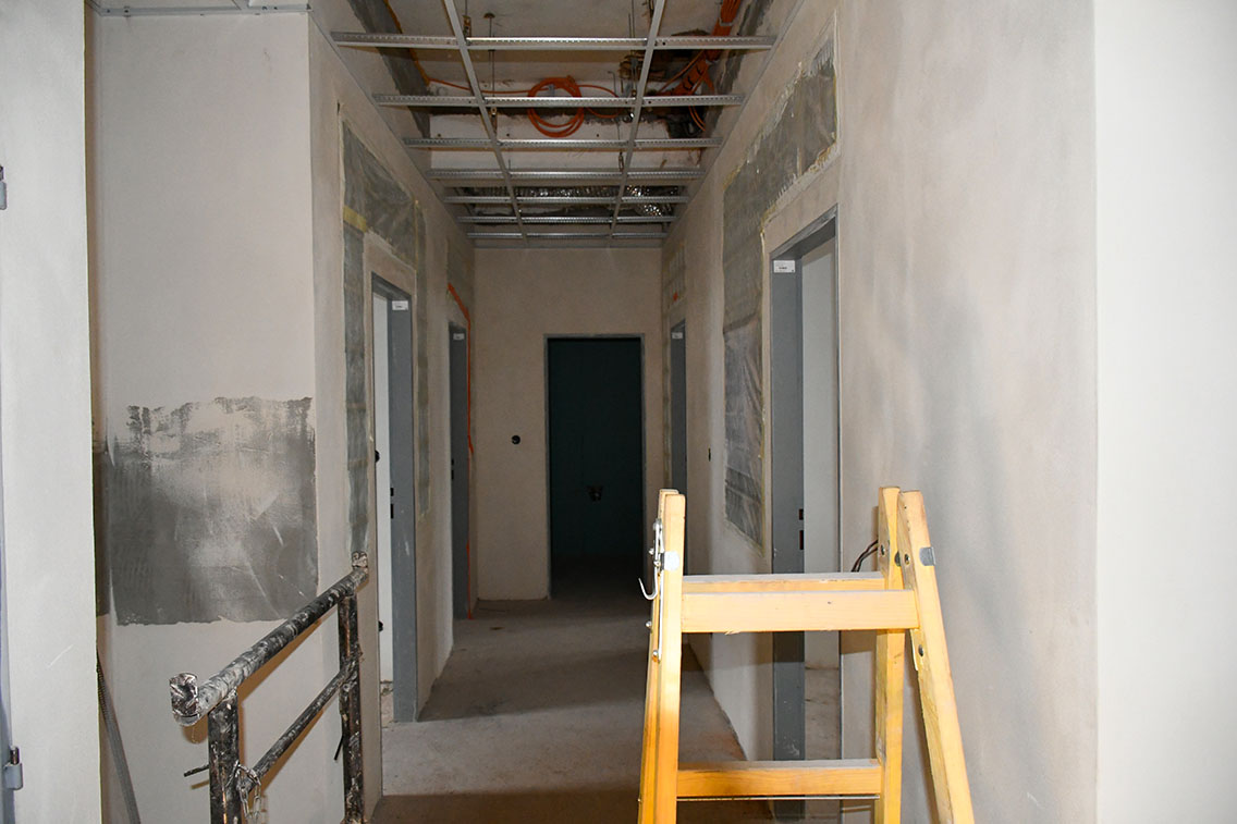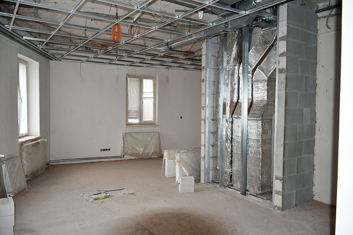 Podstatnou část projektu představují nové slaboproudé a silnoproudé rozvody, nucená výměna vzduchu v celé budově a doplnění vytápění do nevytápěných prostor. Projekt dále počítá s výměnou podlahových krytin, opravou omítek, schodiště, stropů, s novými rozvody zdravotně-technických instalací, výměnou nevyhovujících vnitřních výplní a spoustou drobných úprav. Aktuálně je stavebně zhruba hotové druhé a třetí nadzemní podlaží, kde dokončujeme finální omítky. V prvním nadzemním podlaží se dokončují rozvody inženýrských sítí a zednické práce. Ve čtvrtém podlaží, které je vlastně podkroví, nyní práce stojí z důvodu odhalení nekvalitně provedené opravy střechy. V řešení s investorem je dodatečná oprava krovů a překládku střešní krytiny. Z tohoto důvodu bude zřejmě posunutý i původní termín dokončení rekonstrukce plánovaný na září letošního roku.