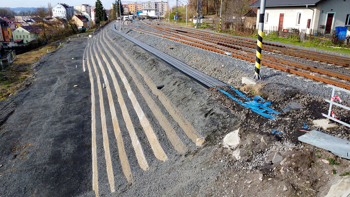 Druhá etapa sanace nestabilního náspu začala loni v září a spočívala v kompletním odtěžení původního železničního náspu pod lichou skupinou kolejí v délce asi 150 metrů až na základovou spáru, vybudování nového náspu vyztuženého štěrkodrtí, který je doplněný modulárním stavebním systémem Green Terramesh, a zřízení nového systému odvodnění s napojením do šachet. V této etapě bylo nutné odtěžit několik tisíc tun materiálu.