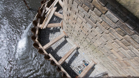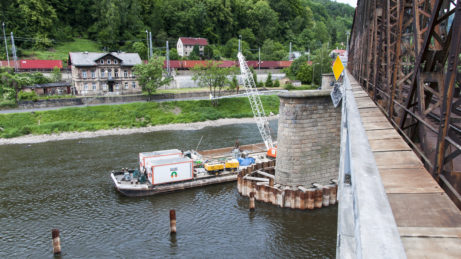 Více než 140 let starý železniční most přes Labe u děčínské městské části Prostřední Žleb zažil mnohé povodně a na základě výsledků potápěčského průzkumu a nutnosti trvalého zajištění bezpečnosti železničního provozu byla provedena sanace části pilíře pod hladinou vody.